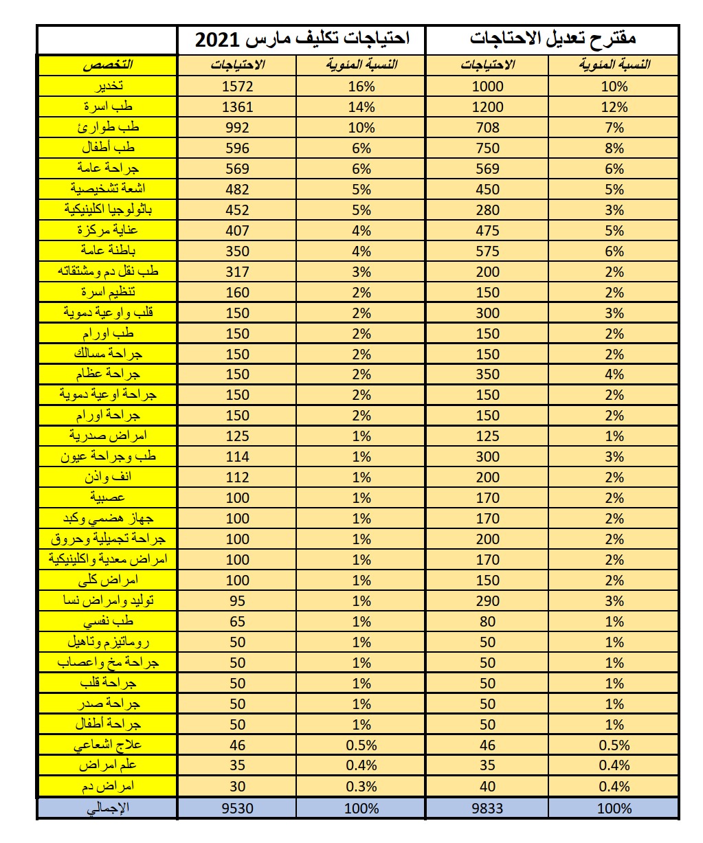 2- إعلان احتياجات المستشفيات في التخصصات والمحافظات من الآن كدليل للمساعدة في اختيار المحافظة والتخصص.
