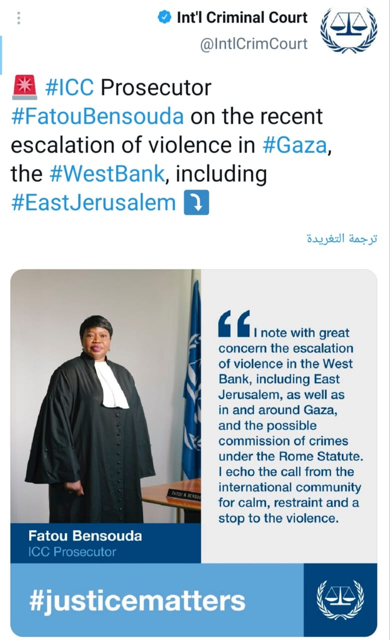 وقالت المدعية العامة للمحكمة الجنائية، فاتو بنسوا، عبر تغريدة لها على تويتر: "نلاحظ بقلق بالغ تصاعد العنف في الضفة الغربية بما فيها القدس الشرقية وغزة واحتمال ارتكاب جرائم بموجب نظام روما المؤسس للمحكمة".