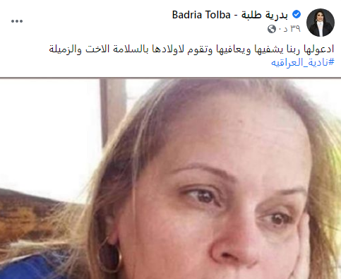 ونشرت بدرية صورة للعراقية، عبر حسابها الرسمي بموقع التواصل الاجتماعي" فيس بوك"، وعلقت: "ادعولها ربنا يشفيها ويعافيها وتقوم لأولادها بالسلامة.. الأخت والزميلة نادية العراقية".