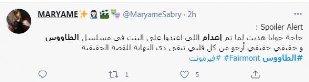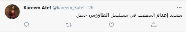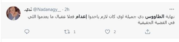 وأبدت متابعة على موقع تويتر إعجابها بنهاية مسلسل الطاووس وكتبت: “الطاووس دي جميلة أوي كان لازم ياخدوا إعدام فعلا عقبال ما يعدموا اللي في القضية الحقيقية”، وأعرب آخر عن سعادته معلقًا: “مشهد إعدام المغتصب في مسلسل الطاووس جميل”.
