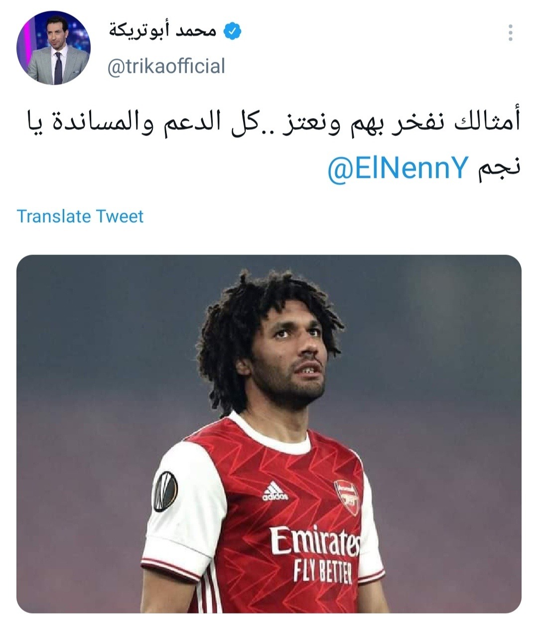 دعم لاعب منتخبنا الوطني والنادي الأهلي السابق محمد أبوتريكة، لاعب وسط فريق أرسنال الإنجليزي محمد النني.