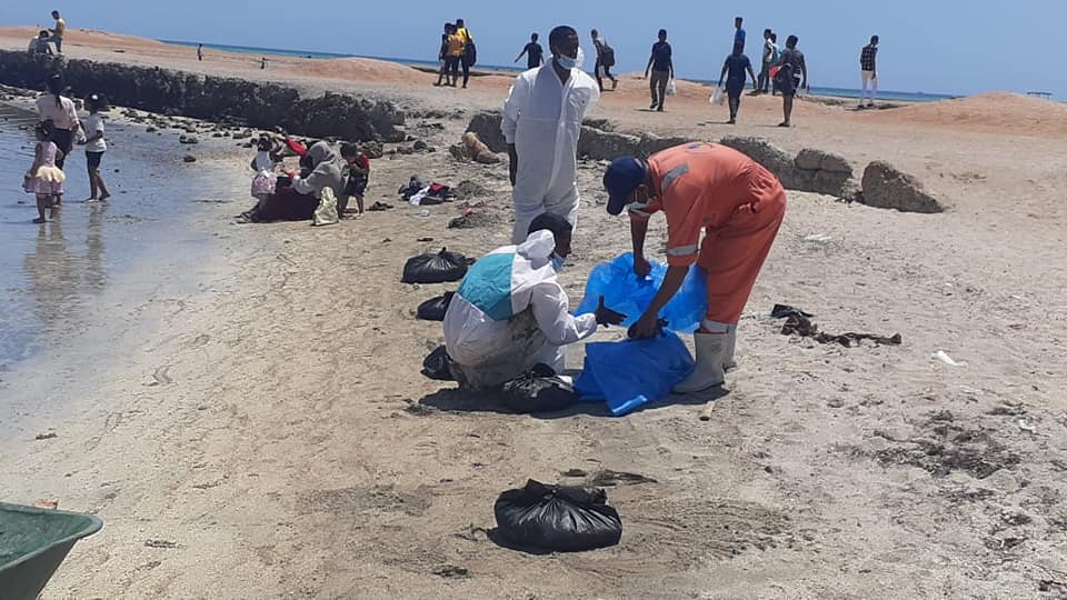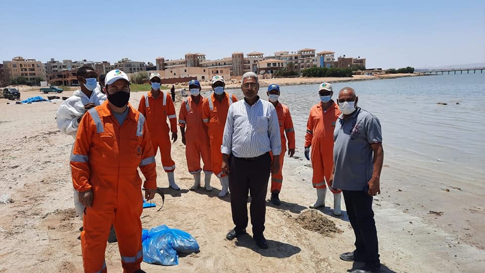 كما قامت اللجنة بمتابعة مكافحة وتنظيف الزيت بالمنطقة المتأثرة و ذلك من قبل شركة بتروسيف مركز مكافحة التلوث البحري بالغردقة .