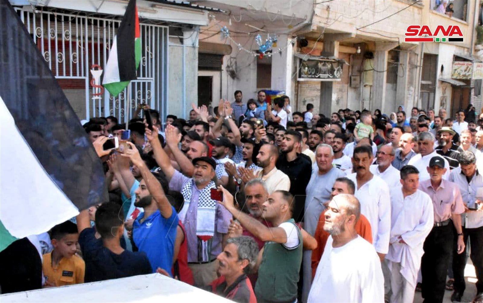 احتشد العشرات من أهالي حي العائدين في محافظة حماة السورية، اليوم الجمعة، نصرة لأهل فلسطين في القدس وغزة ضد العـدوان الإسرائيـلي المتواصل.