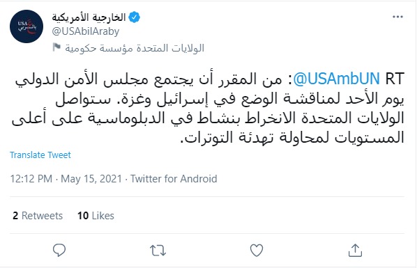 أعلنت الخارجية الأمريكية عبر صفحتها الرسمية على موقع التواصل الاجتماعي "تويتر"، أنه من المقرر أن يجتمع مجلس الأمن الدولي يوم الأحد المقبل لمناقشة الوضع في إسرائيل وغزة، وستواصل الولايات المتحدة الانخراط بنشاط في الدبلوماسية على أعلى المستويات لمحاولة تهدئة التوترات.