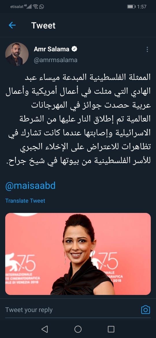 ونشر عمرو سلامة، صورة لها عبر حسابه الشخصي بموقع التغريدات القصيرة “تويتر”، وقال: “الممثلة الفلسطينية المبدعة ميساء عبد الهادي، التي مثلت في أعمال أمريكية وأعمال عربية حصدت جوائز في المهرجانات العالمية تم إطلاق النارعليها من الشرطة الاسرائيلية، وإصابتها عندما كانت تشارك في تظاهرات للاعتراض على الإخلاء الجبري للأسر الفلسطينية من بيوتها في شيخ جراح".