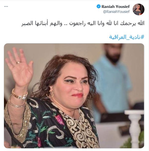 ونشرت رانيا يوسف صورة لنادية العراقية عبر حسابها الشخصي بموقع التغريدات القصيرة “تويتر”، وقالت: “الله يرحمك إنا لله وإنا إليه راجعون.. وألهم أبنائها الصبر”.