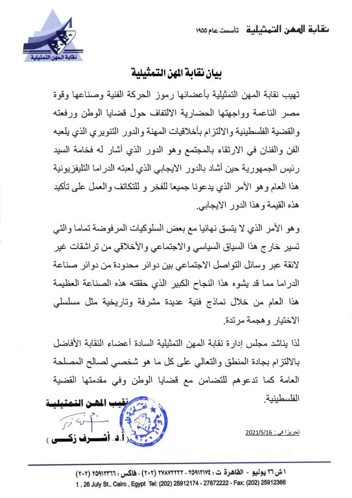 ناشدت نقابة المهن التمثيلية برئاسة نقيبها الدكتور أشرف زكي، أعضائها بالالتزام بجادة المنطق والتعالي على كل ما هو شخصي لصالح المصلحة العامة كما تدعوهم للتضامن مع قضايا الوطن وفي مقدمتها القضية الفلسطينية.
