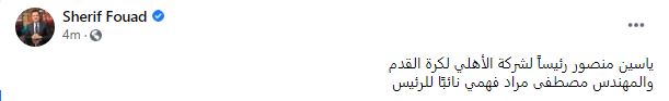 وتابع شريف فؤاد عبر حسابه بـ فيس بوك: "باختصار الرجل المناسب في المكان المناسب، الدكتور سعد شلبي شخصية متميزة مهنيًا وأخلاقيًا فالرجل صاحب مسيرة إدارية طويلة ومتفردة مدعمة بدرجات علمية رصينة وعن دماثة خُلقه وأدبه الجم حدث ولا حرج، اختيار موفق جدًا من قبل محمود الخطيب ومجلس الإدارة، تتسق وطبيعة المرحلة المقبلة التي يسعى فيها الأهلي لنقلة عالمية".