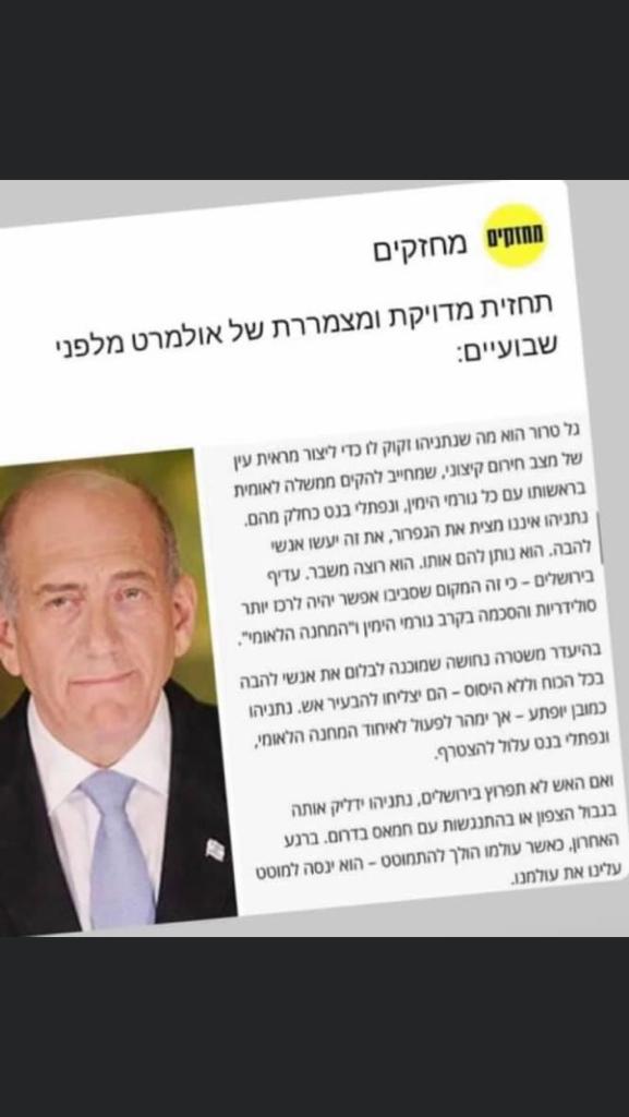 وقال أولمرت في مقال له نُشر سابقًا في صحيفة "معاريف" العبرية، "إن كل ما يحتاج إليه نتنياهو هو موجة من الإرهاب من أجل أن يخلق واقعًا مفتعلًا وكأن هناك حالة طوارئ من الدرجة الأولى التي تتطلب تشكيل حكومة يمينية برئاسته إلى جانب أطراف اليمين ومن بينهم نفتالي بينيت".