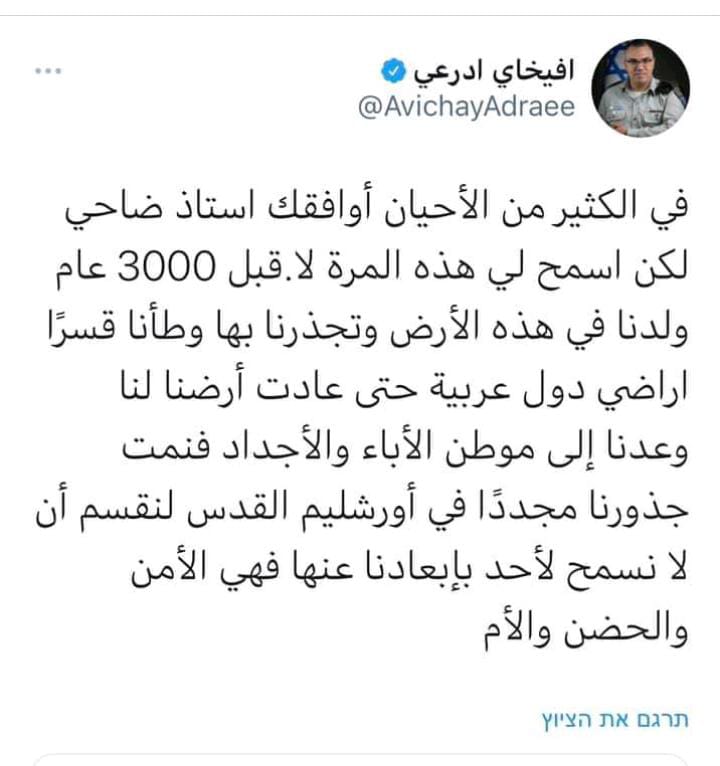 قال أفيخاي أدرعي، المتحدث باسم الجيش الإسرائيلي، عبر صفحته الرسمية على "تويتر"، إنه قبل 3000 عام ولدنا في أرض فلسطين وتجذرنا بها وطأنا قسرًا أراضي دول عربية حتى عادت أرضنا لنا وعدنا إلى موطن الآباء والأجداد فنمت جذورنا مجددًا في أورشليم القدس لنقسم أن لا نسمح لأحد بإبعادنا عنها فهي الأمن والحضن والأم.