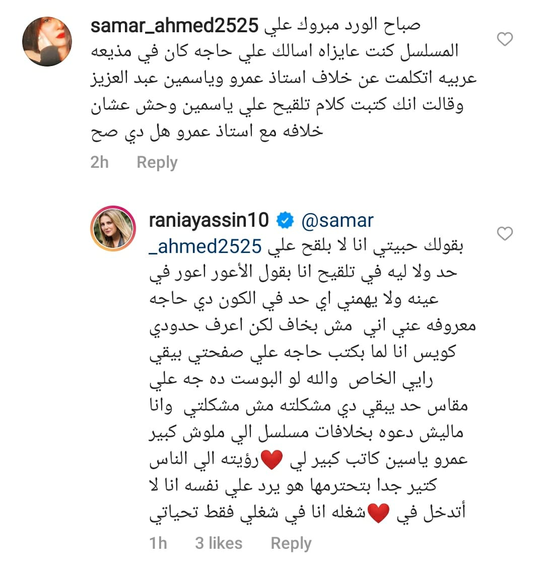 وردت رانيا على سؤال أحد متابعيها التي سألتها عن خلافها مع ياسمين عبد العزيز، قائلةً: “بقولك حبيبتي أنا لا بلقح على حد ولا ليه في تلقيح أنا بقول الأعور أعور في عينه ولا يهمني أي حد في الكون دي حاجة معروفة عني إني مش بخاف لكن أعرف حدودي كويس”.