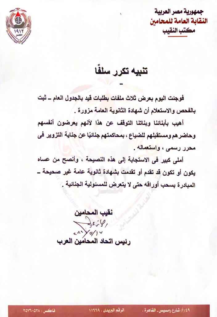 وتابع نقيب المحامين: “أهيب بأبنائنا وبناتنا إلى التوقف عن هذا لأنهم يعرضون أنفسهم وحاضرهم ومستقبلهم للضياع، بمحاكمتهم جنائيًا عن جناية التزوير في محرر رسمي واستعماله، أملى كبير في الاستجابة إلى هذه النصيحة، وأنصح من عساه يكون أو تكون قد تقدم أو تقدمت بشهادة ثانوية عامة غير صحيحة المبادرة بسحب أوراقه حتى لا يتعرض للمسئولية الجنائية".
