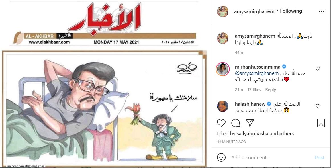 وانهالت التعليقات على الصورة الكاريكاتورية لوالدها التي أعادت نشرها إيمي سمير غانم، ومنها تعليقات من حلا شيحة التي كتبت: الحمد لله على سلامة أستاذ سمير غانم، وأيضا كتبت ميرهان حسين: “حمدا لله على سلامته حبيبتي”.