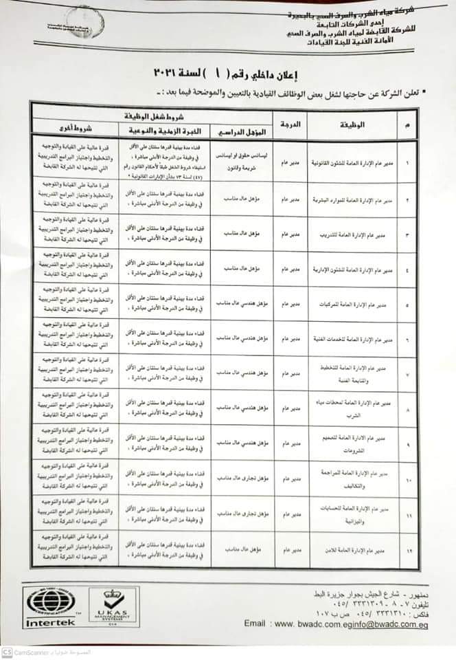 "مياه البحيرة" تعلن حاجتها لعدد من الوظائف القيادية.. تعرف عليها
