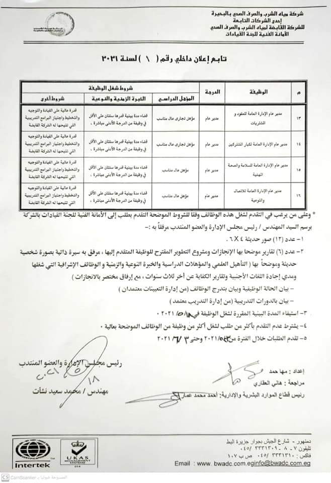 ويتقدم الراغبين في شغل الوظائف الشاغرة بالشركة، بعدد 12 صورة حديثة 4 × 6، عدد 6 تقارير موضحة بها الإنجازات ومشروع التطوير المقترح للوظيفة المتقدم إليها، مرفق به سيرة ذاتية بصورة شخصية حديثة وموضحا بها، التأهيل العلمي والمؤهلات الدراسية والخبرة النوعية والزمنية والوظائف الإشرافية التي شغلها، ومدي إجادة اللغات الاجنبية، وتقارير الكفاءة عن أخر ثلاث سنوات، مع إرفاق مختصر بالإنجازات.