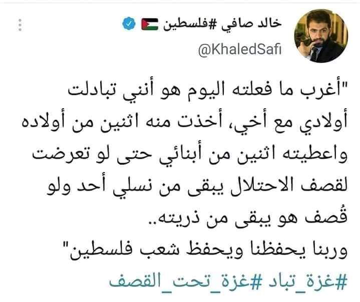 وحرصا على المشاركة في تحرير القدس من مغتصبيها سواء شخصيا أو عن طريق الأبناء، قام الشاب الفلسطيني، خالد صافي، بمقاسمة أولاده مع أخيه، حيث أخذ كل منهما اثنين من أبناء الآخر، ليبقى من ذرية كل منهما أحد في حال استهدف الاحتلال لأحد المنزلين.