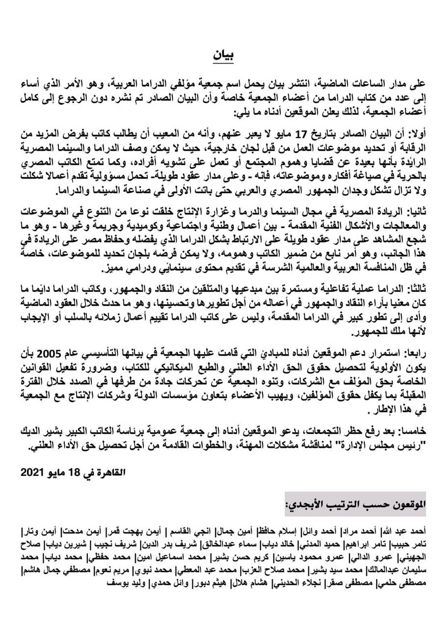 أولا: البيان الصادر بتاريخ 17 مايو لا يعبر عنهم، وأنه من المعيب أن يطالب كاتب بفرض المزيد من الرقابة أو تحديد موضوعات العمل من قبل لجان خارجية، حيث لا يمكن وصف الدراما والسينما المصرية الرائدة بأنها بعيدة عن قضايا وهموم المجتمع أو تعمل على تشويه أفراده، وكما تمتع الكاتب المصري بالحرية في صياغة أفكاره وموضوعاته، فإنه وعلى مدار عقود طويلة، تحمل مسؤولية تقدم أعمال شكلت ولا تزال تشكل وجدان الجمهور المصري والعربي حتى باتت الأولى في صناعة السينما والدراما.