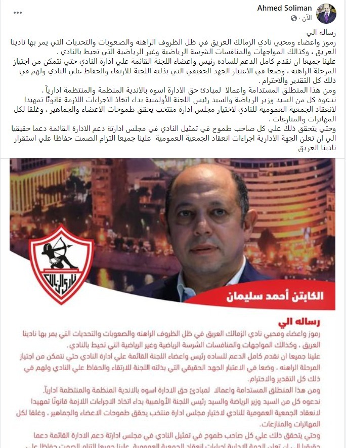 وكتب سليمان عبر صفحته على فيس بوك: “رسالة إلى رموز وأعضاء ومحبي نادي الزمالك العريق في ظل الظروف الراهنة والصعوبات والتحديات التي يمر بها نادينا العريق، وكذلك المواجهات والمنافسات الشرسة الرياضية وغير الرياضية التي تحيط بالنادي”.