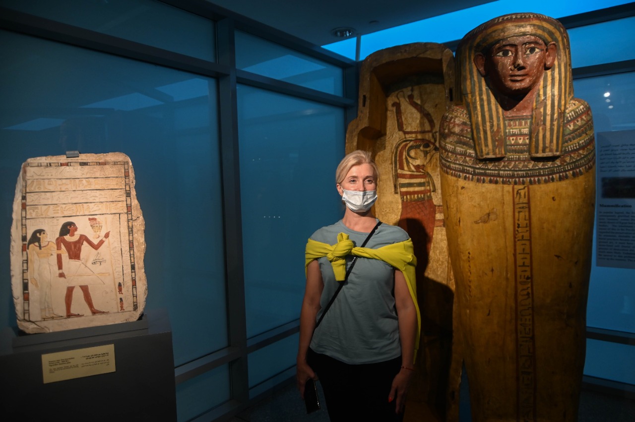 وحرصت الزائرة على التقاط الصور التذكارية لها مع بعض القطع الأثرية.