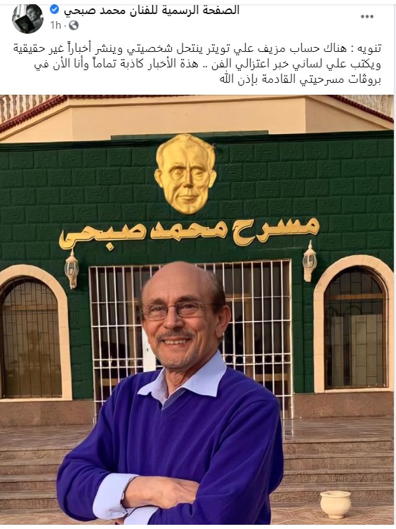 وكتب محمد صبحي، منشورًا عبر صفحته الرسمية على "فيس بوك"، قائلًا: “هناك حساب مزيف على تويتر ينتحل شخصيتي وينشر أخبارًا غير حقيقية ويكتب على لساني خبر اعتزالي الفن.. هذه الأخبار كاذبة تمامًا وأنا الآن في بروفات مسرحيتي القادمة بإذن الله”.
