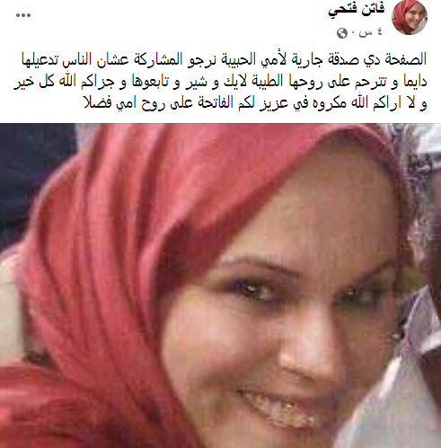 وكتبت ابنة العراقية منشورًا،عبر حسابها الرسمي بموقع التواصل الاجتماعي “فيس بوك”، قائلة: "الصفحة دي صدقة جارية لأمي الحبيبة، نرجو المشاركة عشان الناس تدعيلها دايمًا وتترحم على روحها الطيبة، لايك وشير وتابعوها، وجزاكم الله كل خير، ولا أراكم الله مكروه في عزيز لكم.. الفاتحة على روح أمي فضلا".