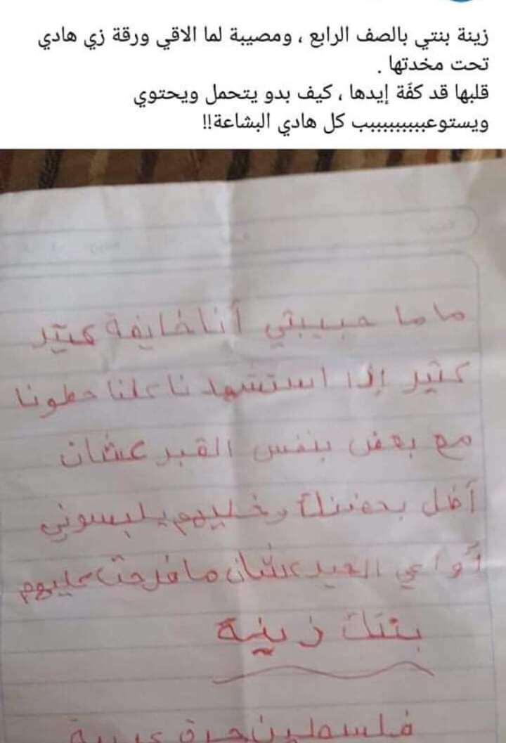 تداول مستخدمو مواقع التواصل الاجتماعي صورة لرسالة بخط اليد لطفلة فلسطينية، في الصف الرابع الابتدائي، وتضمنت الرسالة وصية في حال توفي جميع أفراد أسرتها مع بعضهم.