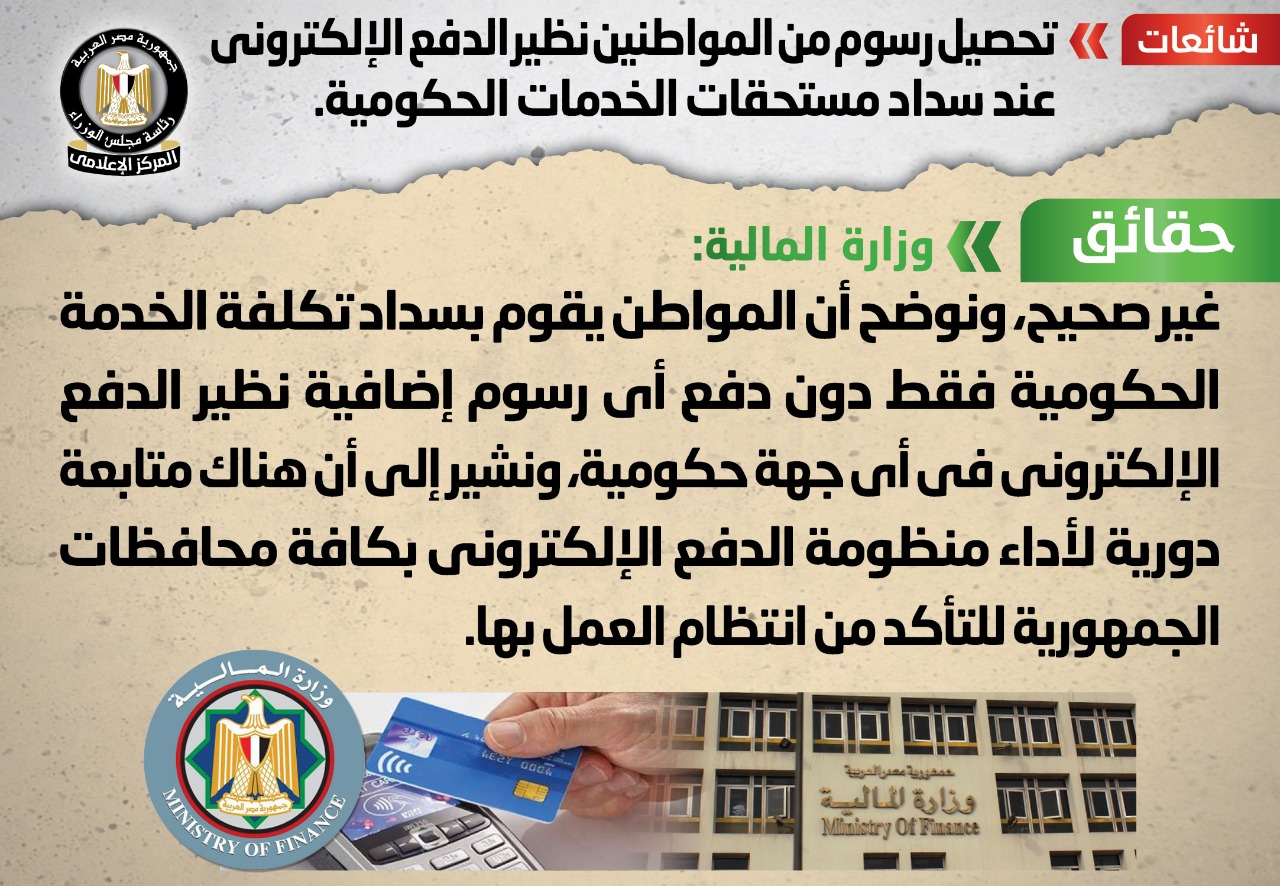 وأكدت “المالية” أنه لا صحة لتحصيل رسوم من المواطنين نظير الدفع الإلكتروني عند سداد مستحقات الخدمات الحكومية، مُوضحةً أن المواطن يقوم بسداد تكلفة الخدمة الحكومية فقط دون دفع أي رسوم إضافية نظير الدفع الإلكتروني في أي جهة حكومية، مُشيرةً إلى أن هناك متابعة دورية لأداء منظومة الدفع الإلكتروني بكافة محافظات الجمهورية للتأكد من انتظام العمل بها.
