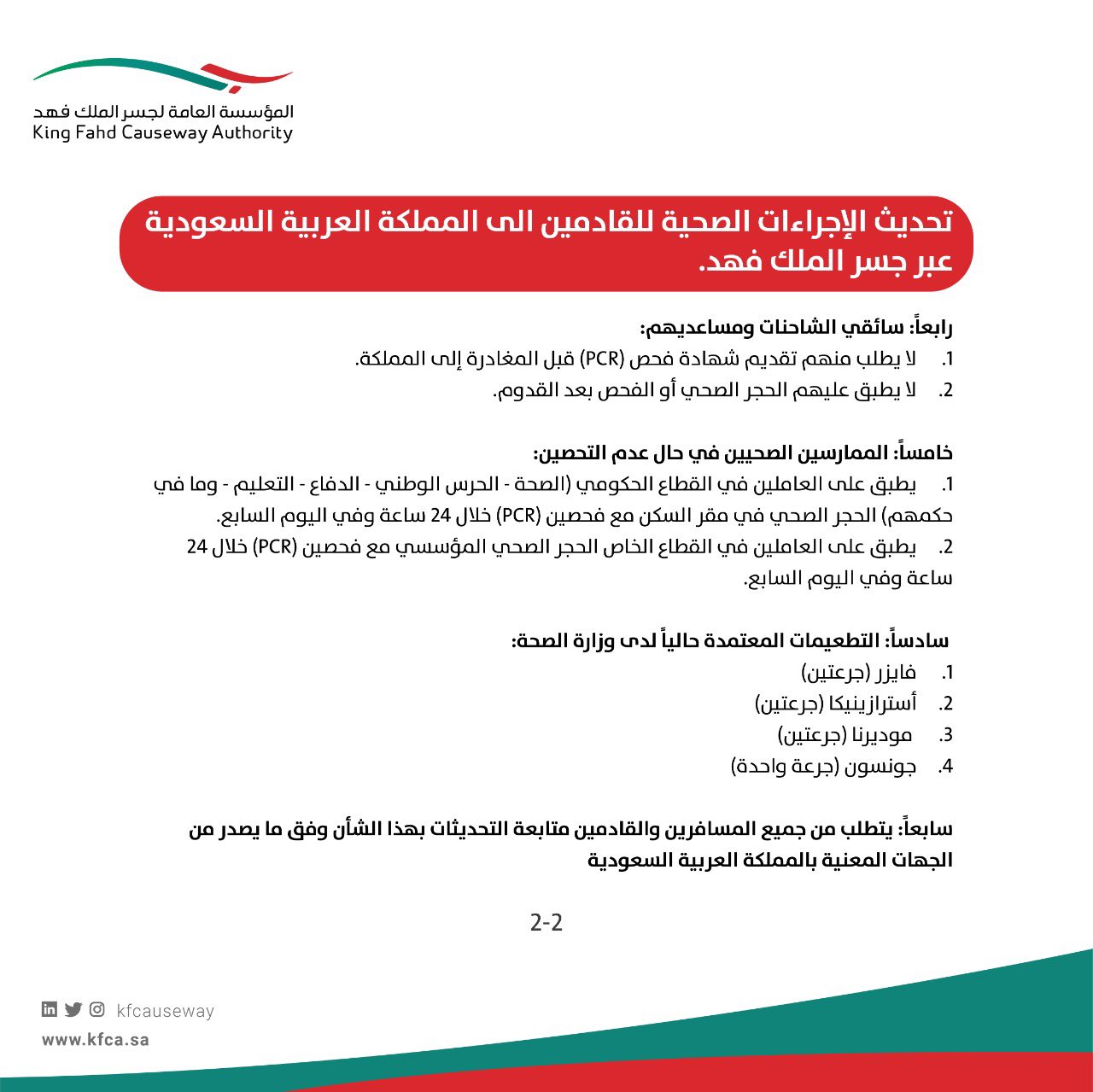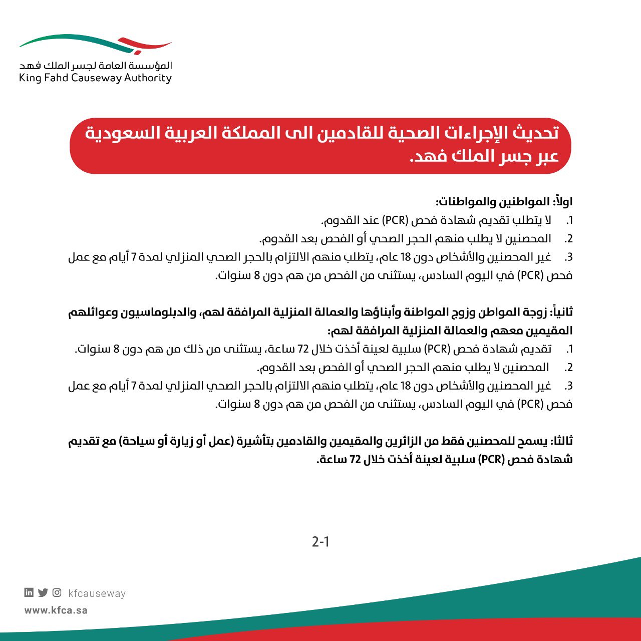 وأصدرت الإدارة تحديثات بالإجراءات الصحية المطلوبة من الجهات المختصة لدخول المملكة عبر منفذ جسر الملك فهد، من ضمنها عدم إخضاع المحصنين للحجر الصحي أو الفحص عند دخول المملكة العربية السعودية .