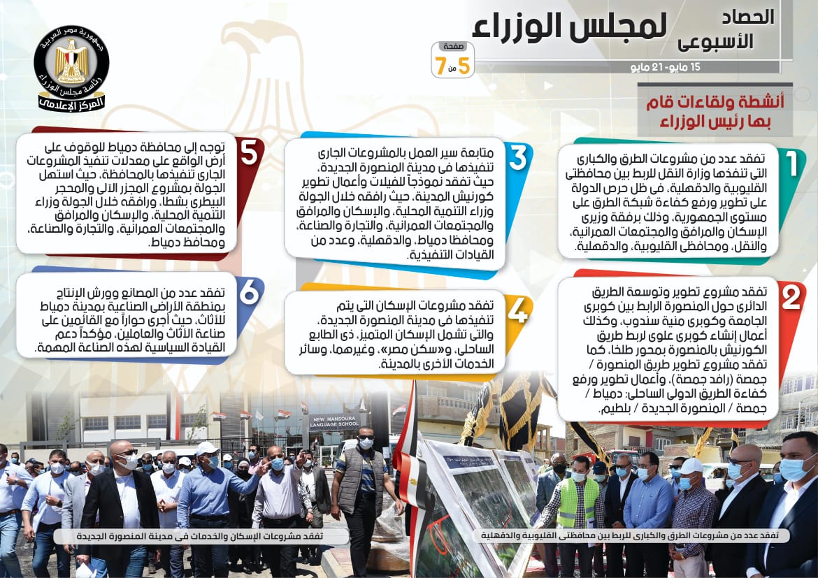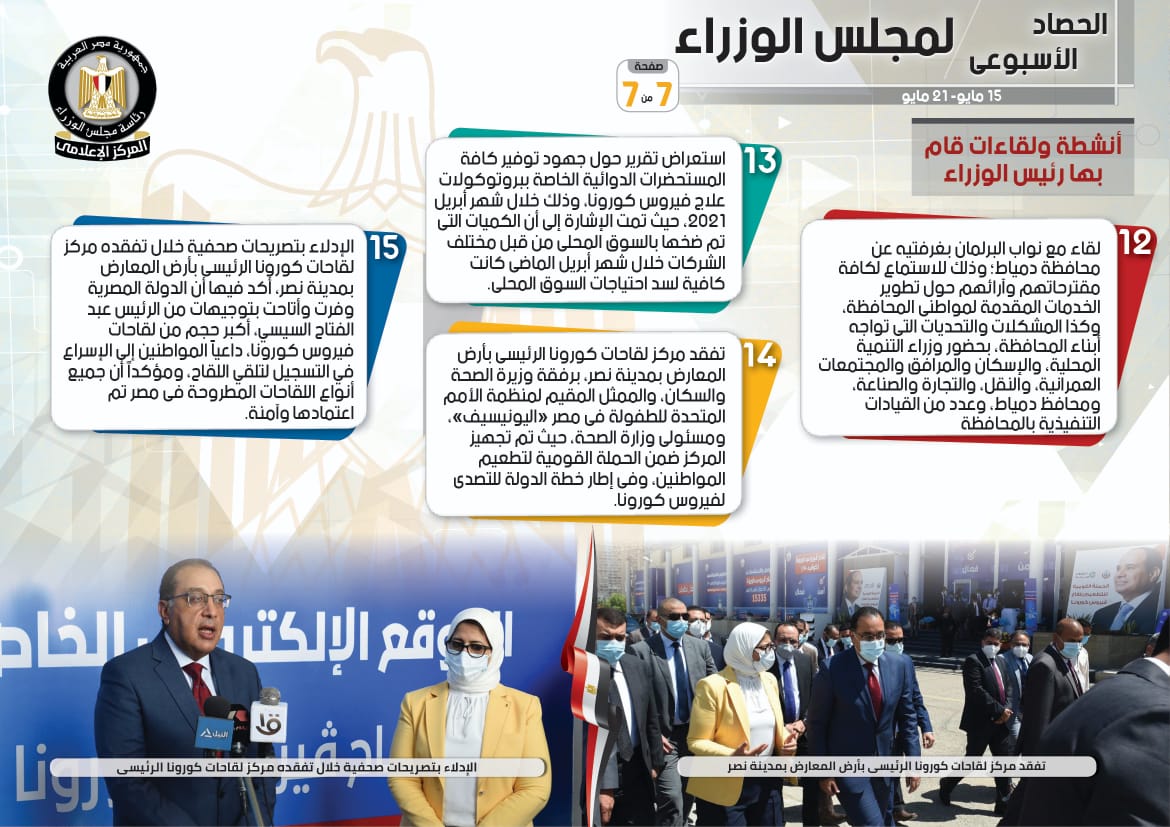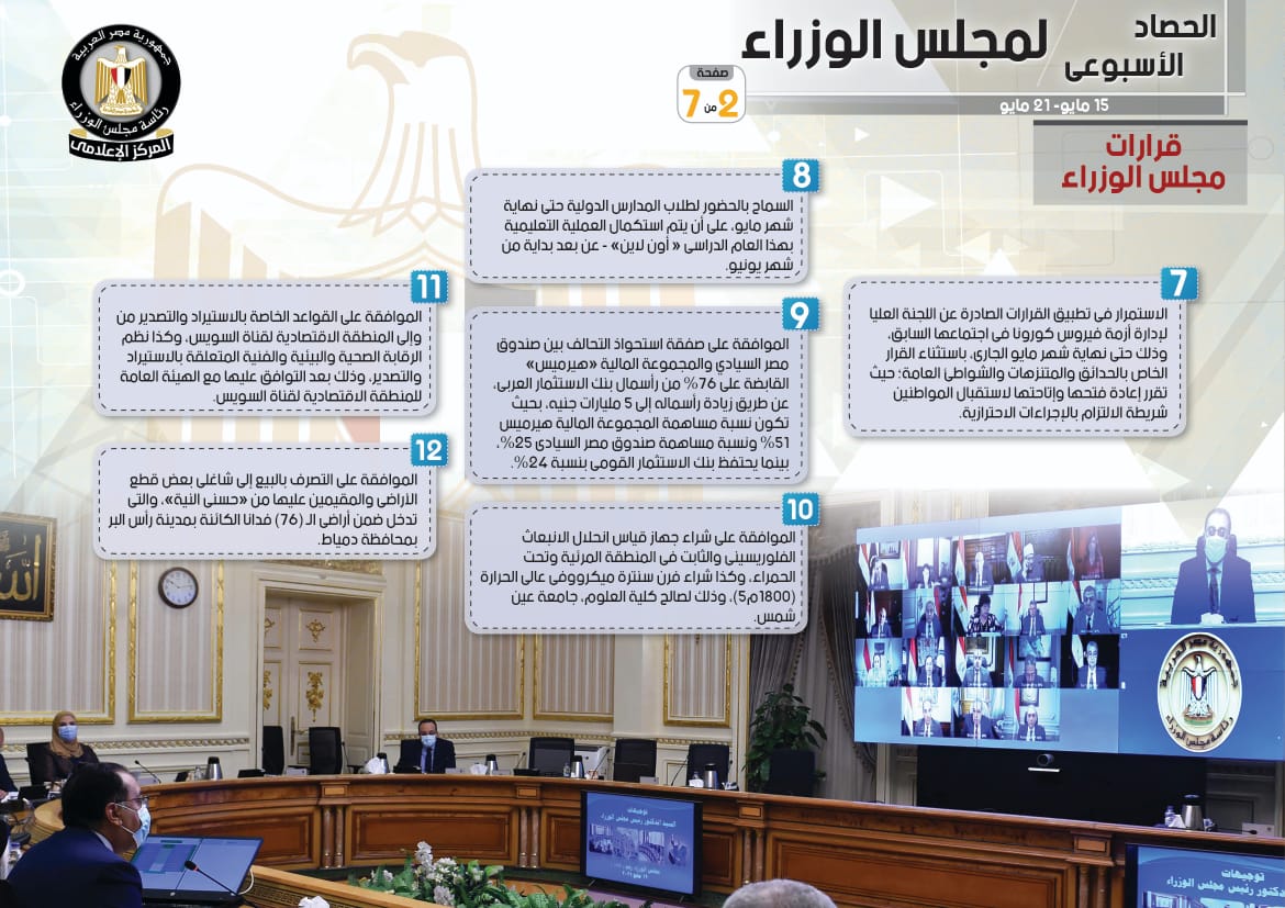 الحصاد الأسبوعي لمجلس الوزراء خلال الفترة من 15 حتى 21 مايو 2021 (إنفوجراف)