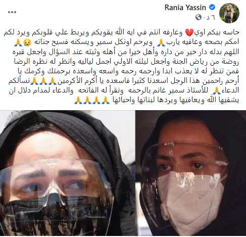 ونشرت رانيا صورة لإمي ودنيا، عبر حسابها الرسمي بموقع التواصل الاجتماعي "فيس بوك"، وعلقت عليها قائلة: "حاسة بيكم أوي، وعارفه أنتم في أي، الله يقويكم ويربط على قلوبكم، ويرد لكم أمكم بصحة وعافية يارب، ويرحم أونكل سمير، ويسكنه فسيح جناته".
