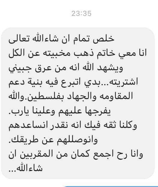 وأوضح حساب آخر يتبين أنه لامرأة أنها تريد التبرع بقطعة ذهبية خاصة بها لدعم الجهاد بفلسطين، تلك الفكرة التي طرحها أحد المشجعين للهاشتاج وهي ضرورة التركيز على أن النساء تقتني بعض القطع الذهبية التي يمكن أن تتبرع بها من أجل المقاومة الشعبية.