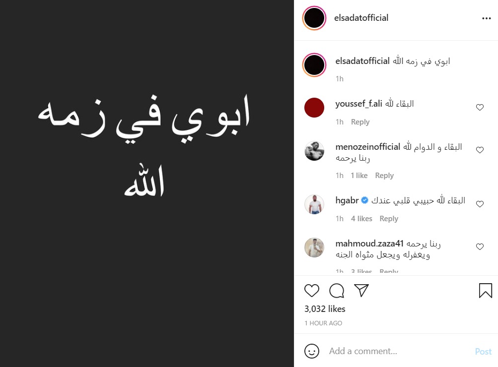 وكتب السادات عبر حسابه الرسمي بموقع الصور والفيديوهات “انستجرام”، منشور قال فيه: “أبوي في ذمة الله”، وبدأ جميع متابعيه مواساته في التعليقات.