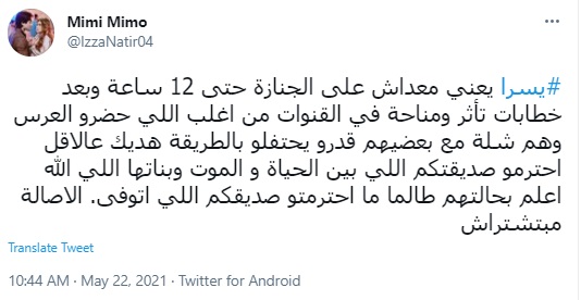 ونشر حساب باسم ميمي ميمو:" #يسرا يعني معداش على الجنازة حتى 12 ساعة وبعد خطابات تأثر ومناحة في القنوات من أغلب اللي حضروا العرس، وهم شلة مع بعضيهم قدروا يحتفلوا بالطريقة هديك عالاقل احترموا صديقتكم اللي بين الحياة و الموت وبناتها اللي الله اعلم بحالتهم طالما ما احترموا صديقكم اللي اتوفى الأصالة مبتشتراش".