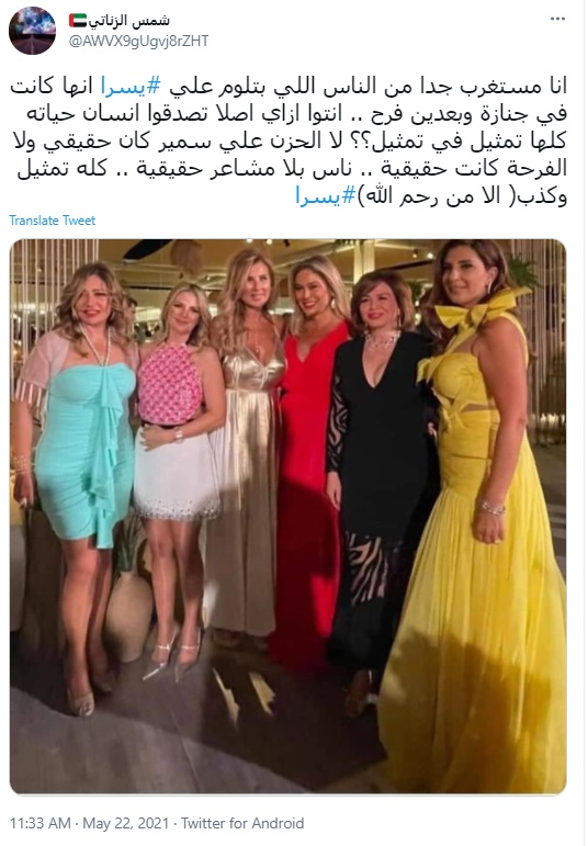 وكتب حساب أخر باسم شمس الزناتي:" انا مستغرب جدا من الناس اللي بتلوم علي يسرا انها كانت في جنازة وبعدين فرح.. أنتوا أزاي أصلا تصدقوا إنسان حياته كلها تمثيل في تمثيل؟؟ لا الحزن على سمير كان حقيقي ولا الفرحة كانت حقيقية.. ناس بلا مشاعر حقيقية.. كله تمثيل وكذب (الا من رحم الله)".