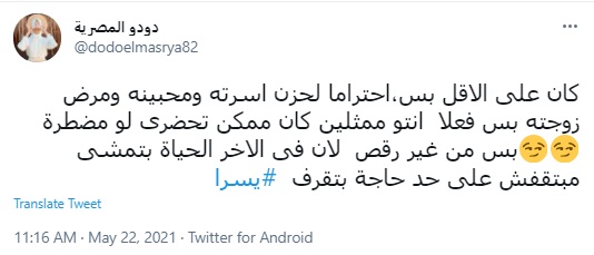 وقالت حساب تمت اسم دودو المصرية:" كان على الأقل بس، احتراما لحزن أسرته ومحبينه ومرض زوجته بس فعلا أنتو ممثلين كان ممكن تحضري لو مضطرة بس من غير رقص لأن في الآخر الحياة بتمشي مبتقفش على حد حاجة بتقرف".