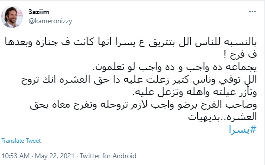 وتضامن مع يسرا، حساب باسم عظيم، قائلًا:" بالنسبة للناس اللي بتتريق ع يسرا انها كانت ي جنازة وبعدها في فرح، يا جماعة ده واجب وده واجب لو تعلمون، الل توفي وناس كتير زعلت عليه ده حق العشرة انك تروح وتأزر عيلته وأهله وتزعل عليه، وصاحب الفرح برضوا واجب لازم تروحله وتفرح معاه بحق العشرة ..بديهيات".