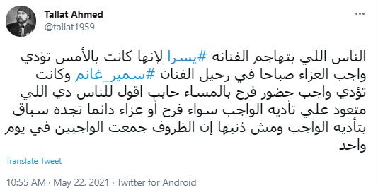 إلى جانب طلال أحمد، الذي كتب:" الناس اللي بتهاجم الفنانة، يسرا لأنها كانت بالأمس تؤدي واجب العزاء صباحا في رحيل الفنان سمير غانم، وكانت تؤدي واجب حضور فرح بالمساء حابب أقول للناس دي اللي متعود علي تأدية الواجب سواء فرح أو عزاء دائما تجده سباق بتأدية الواجب ومش ذنبها إن الظروف جمعت الواجبين في يوم واحد".