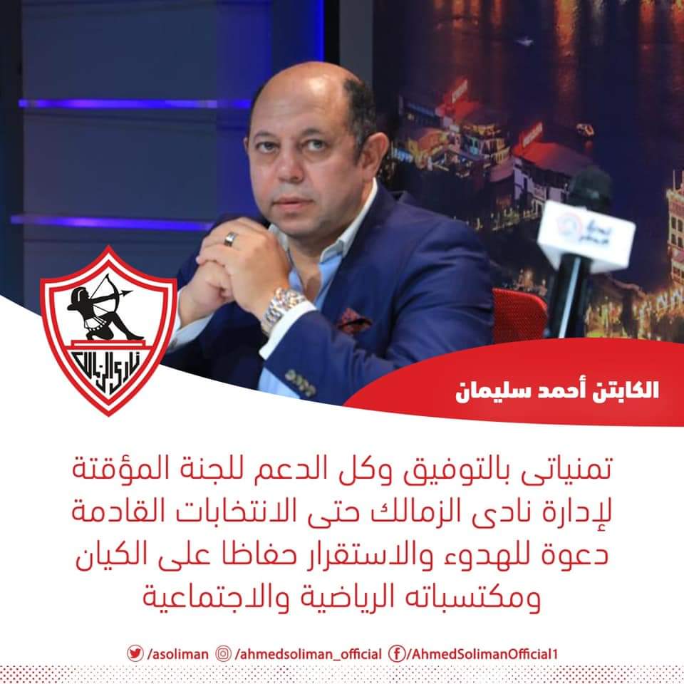 ونشر أحمد سليمان عبر صفحته منشور، قائلا: “أتمنى التوفيق وكل الدعم للجنة الزمالك المؤقتة لإدارة نادي الزمالك حتى الانتخابات القادمة”، مضيفا: “دعوة للهدوء والاستقرار حفاظا على الكيان ومكتسباته الرياضية والاجتماعية”.