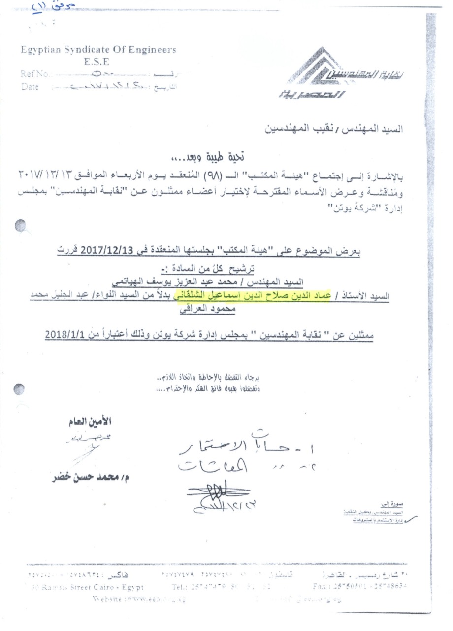 وأشار "حشيش" إلى أن مذكرة التفاهم المشار إليها في الخطاب المتداول بين نقابة المهندسين وشركة المهندس يوتن لم يتم التزام النقابة تنفيذها لذا أصبحت هي والعدم سواء، وأنه بعد استلام المجلس الحالي برئاسة نقيب المهندسين تم عقد عدة اجتماعات للوصول إلي تفاهم واقعي وعملي لمحافظة على حصة نقابة المهندسين وآخرها الاجتماع في 11/09/2018 وأيضاً اجتماع الجمعية العمومية الغير عادية للشركة في 12/9/2018 والاتفاق علي توزيع نقدي بقيمة 105 ملايين من أرباح الشركة ولأول مرة منذ 2011، وهذا المبلغ الذي تم ضخه لحصة النقابة في رأس المال للمحافظة على نسبة النقابة.