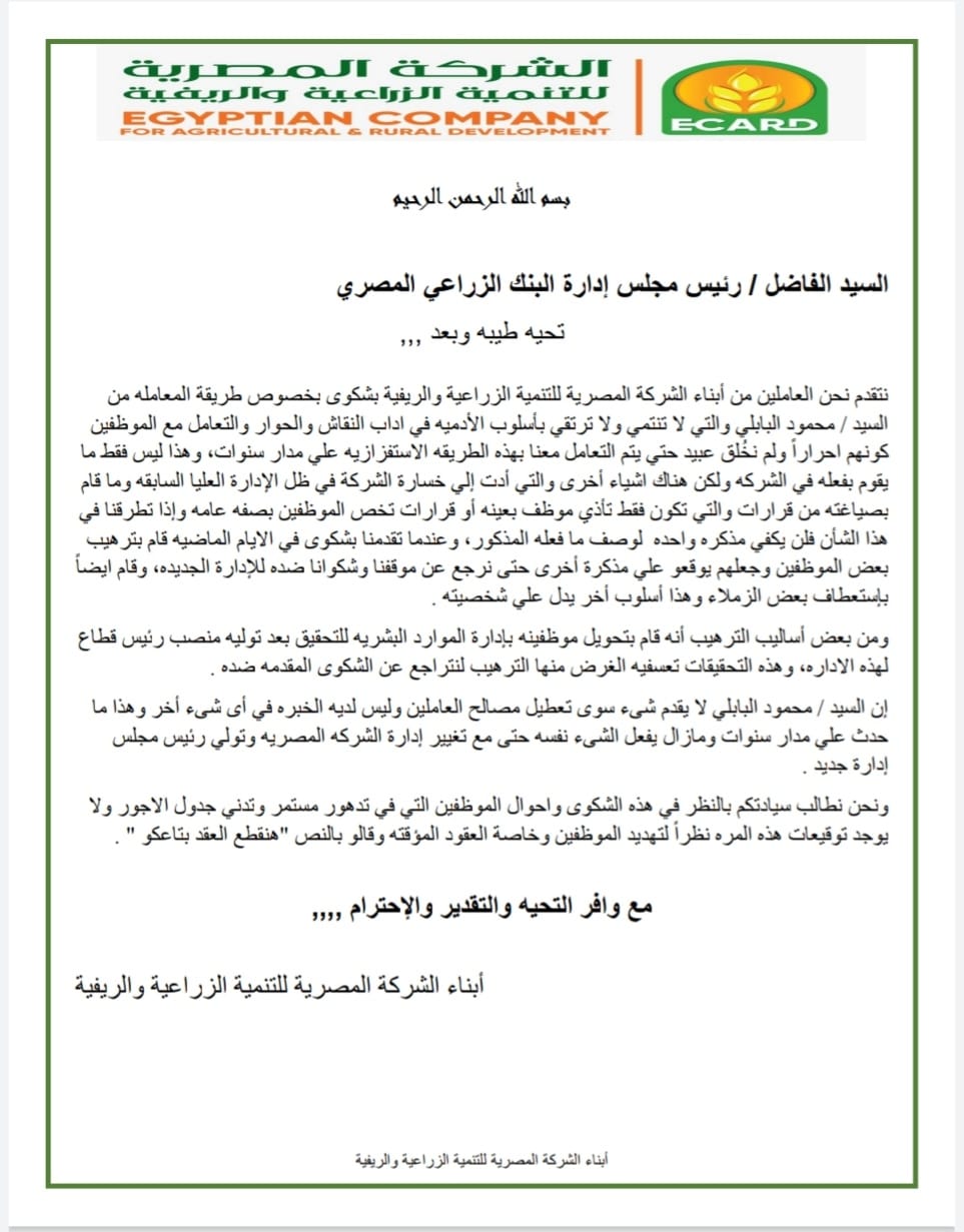 اللجنة النقابية بالشركة المصرية للتنمية الزراعية تطلب صرف حقوق العمال المتأخرة (مستندات)