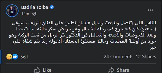 وتلقت بدرية العديد من الاتصالات الهاتفية للاطمئنان على حالة شريف دسوقي، لذا عادت بدرية وكتبت تفاصيل أكثر عن العملية الجراحية مشيرة إلى أن الفنان الشهير بـ "سبعبع" أصيب بجرح في ساقه الشمال، وهو مريض بالسكر وساءت حالته للغاية، وعقب إجراء العديد من الأشعة والتحاليل قرر الطبيب المعالج بتر ساقه من تحت الركبة.