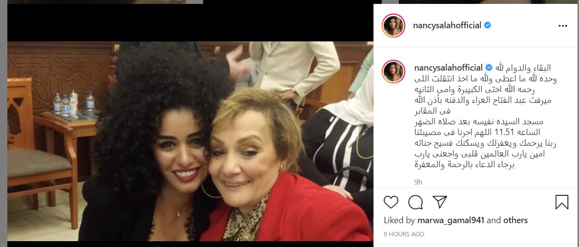 أعلنت الفنانة الشابة نانسي صلاح، وفاة اختها، صباح اليوم الثلاثاء، بعد يومين فقط من وفاة والدتها.