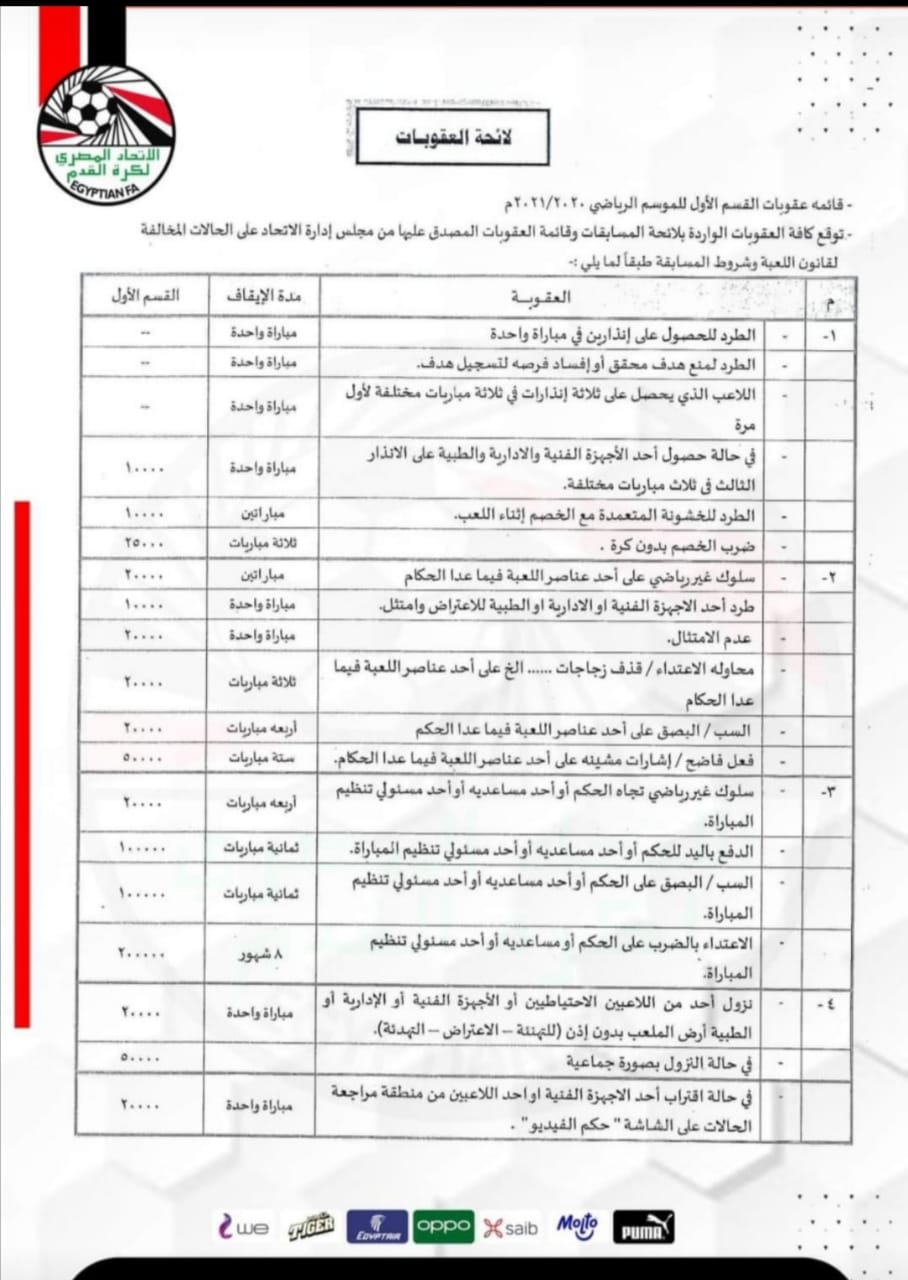 وتنص لائحة اتحاد الكرة على إيقاف اللاعب الذي يتم طرده للخشونة المتعمدة أثناء اللعب مباراتين وتغريمه 10 آلاف جنيه، كما أن اللائحة أيضًا تنص على أن اللاعب الذي يضرب الخصم بدون كرة يتم إيقافه 3 مباريات وتغريمه 25 ألف جنيه.