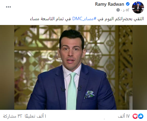 وكتب رامي في منشور عبر حسابه الرسمي بموقع التواصل الاجتماعي “فيس بوك”، منشورا قال فيه: “ألتقي بحضراتكم اليوم في مساء DMC تمام التاسعة مساءً”.