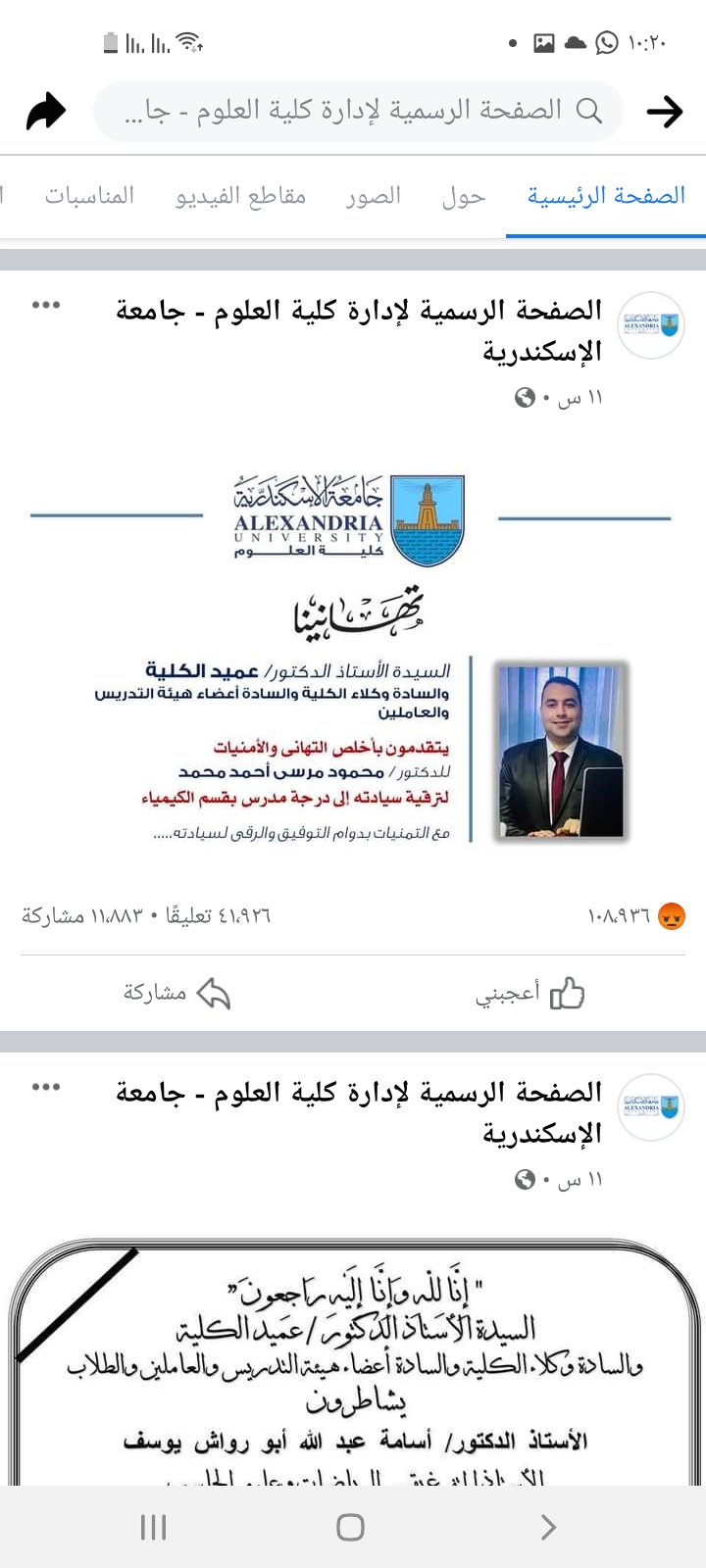 وكان المنشور الذي أطلقته "كلية العلوم" بجامعة الإسكندرية، اليوم الثلاثاء، أثار حفيظة الطلاب من الخريجين، حيث تضمن المنشور، صورة تحمل برقية تهنئة من قبل عميد ووكلاء وأعضاء هيئة التدريس بكلية العلوم، لأحد أعضاء الهيئة بالكلية، بعد ترقيته إلى درجة مُدرس بقسم الكيمياء.
