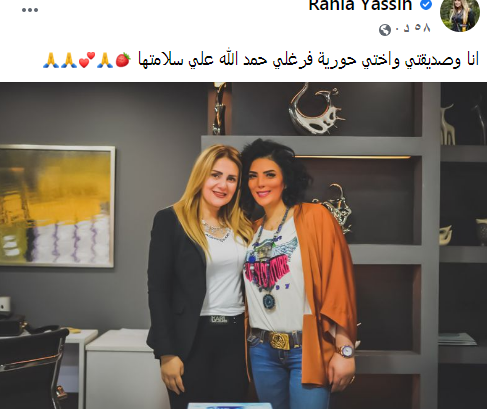 ونشرت رانيا الصورة، عبر حسابها الرسمي بموقع التواصل الاجتماعي "فيس بوك"، وعلقت عليها قائلة: "أنا وصديقتي وأختي حورية فرغلي حمد الله علي سلامتها".