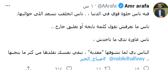 وكتب عمرو تغريدة، عبر حسابه الرسمي بموقع التغريدات القصيرة "تويتر"، قائلًا: "فيه ناس حلوة قوي في الدنيا، ناس اتخلقت تسعد اللي حواليها، ناس ما تعرفش تقول كلمة بايخة أو تعليق جارح، ناس عاوزة تدي ما تاخدش، الناس دي لما تشوفها معدية، تبقى نفسك تقلدها من كتر ما بتحبها".