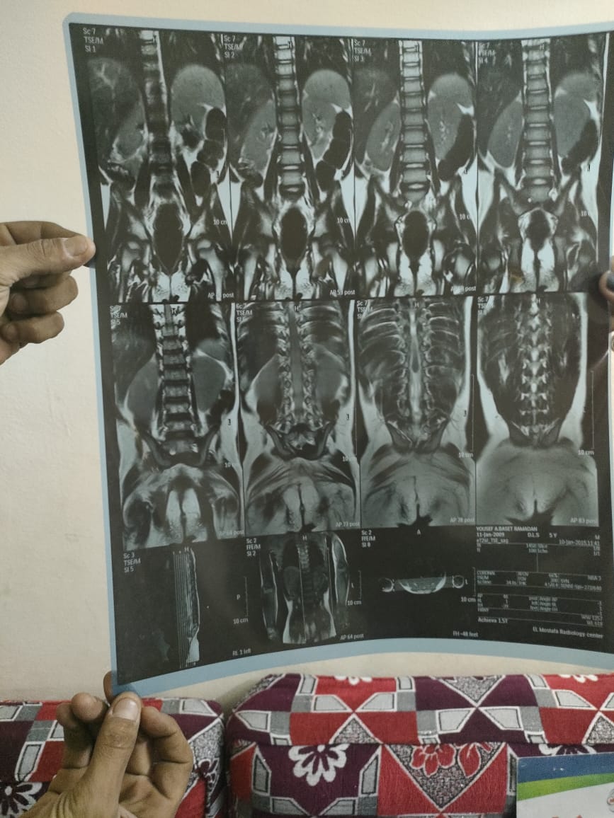 وتابع: "ذهبنا به لمركز الأشعة وأكدوا لنا أن هذا عيب خلقي، وقمنا بالبحث عن الأطباء المتخصصين ذو الخبرة والكفاءة حتى نستطيع معالجته، ونجحت إحدى العمليات التي تم إجراءها في قدميه وهي شد أوتار تصل إلى 3000 جنيه في الجلسة، و بعد معاناة استطاعوا أن يقوموا قدميه المعوجتين، وابني يعاني أيضا من مشكلة التبول والتبرز وتم إجراء الأشعة وعمل عملية توسيع باءت بالفشل نظرا لأن الطفل يحتاج إلى نخاع شوكي، وقمت ببيع التاكسي الخاص بي حتي استطيع معالجة ابني ولكن العمليات التي يحتاج أكثر من 500 ألف جنيه خارج مصر".