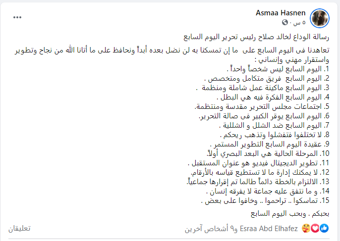 وجاء نص الرسالة التي أرسلها رئيس تحرير اليوم السابع قائلاً:"تعاهدنا فى اليوم السابع على ما إن تمسكنا به لن نضل بعده أبداً ونحافظ على ما أتانا الله من نجاح وتطوير واستقرار مهني وإنساني :