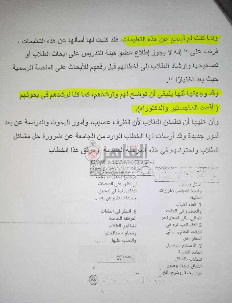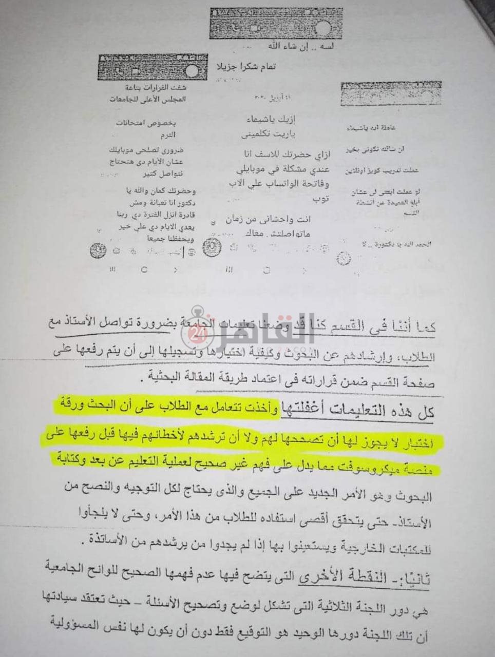 حصل “القاهرة 24” على مستندات تفيد حدوث واقعة مؤسفة في كلية الآداب جامعة الإسكندرية، عبارة عن مذكرة صادرة من الدكتورة سميرة عاشور، رئيس قسم اللغات الشرقية سابقا بكلية آداب بالجامعة إلى عميدة كلية الآداب السابقة ضد الدكتورة شيماء صادق، وثبت بهذا المذكرة تحريض رئيسة القسم الدكتورة سميرة عاشور، لأساتذة القسم ومنهم الدكتورة شيماء صادق، بنجاح الطلاب في الامتحانات الكلية وأن يتم التعامل مع امتحانات الأبحاث مثل أبحاث الماجستير والدكتوراه.